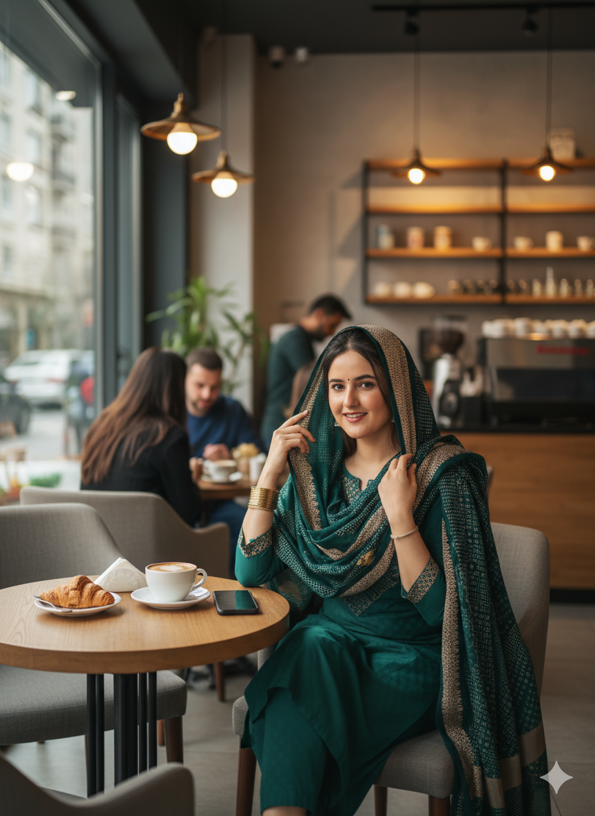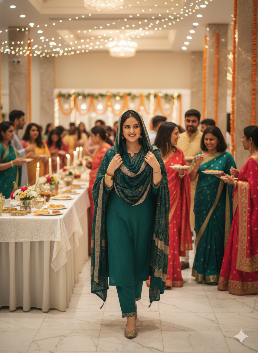 Elevate your look with our Deep Green Festive Kurta Set. Features a classic solid kurti paired with an intricately patterned Banarasi/Jacquard dupatta. Perfect for festivals. RX Consultant.