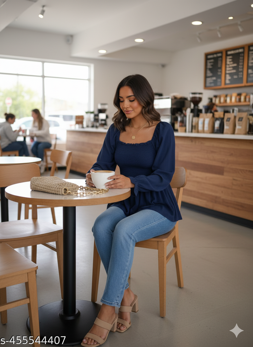 Get the essential Navy Blue Smocked Peplum Top. Flattering fit, full puff sleeves, and a trendy square neckline. Easily pairs with jeans or skirts for a night out. RX Consultant style