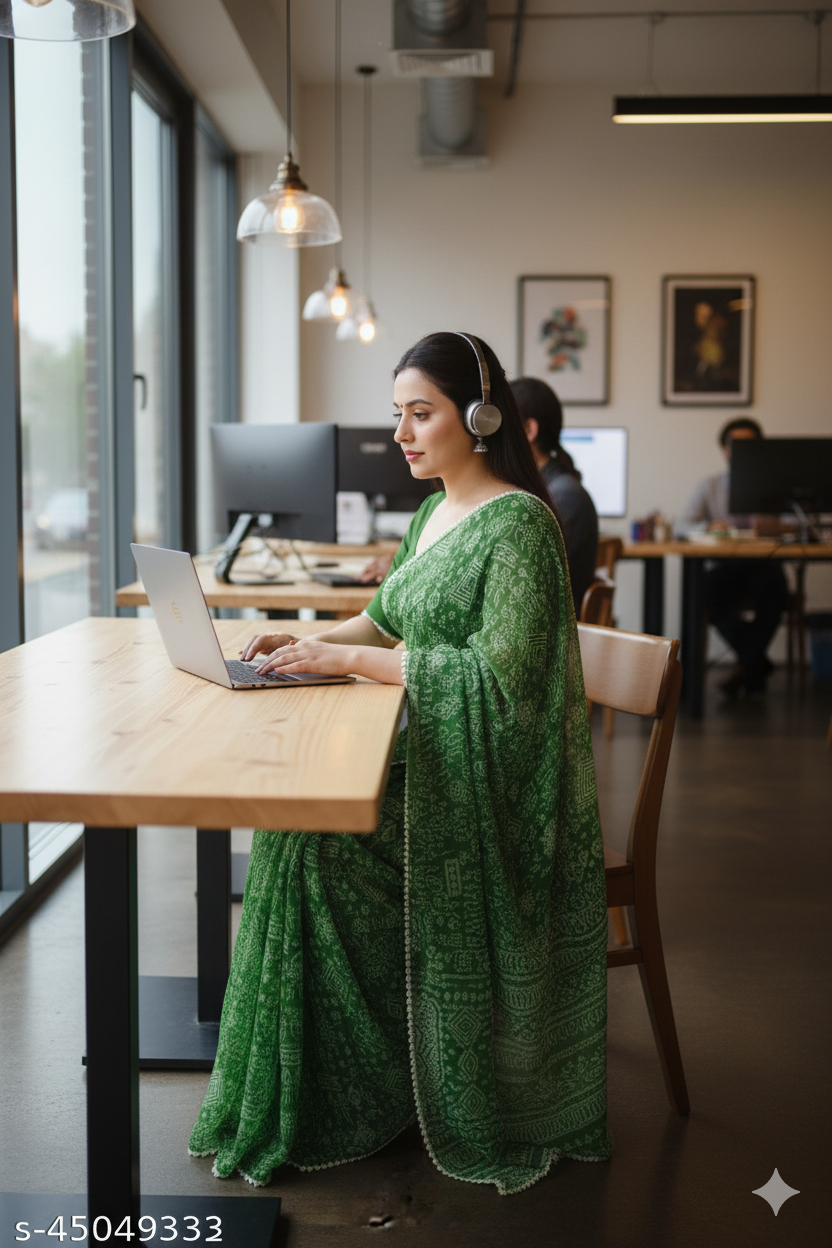 Drape yourself in the beautiful Green Printed Georgette Saree. Lightweight fabric with a striking tribal/Bandhani print and delicate lace border. Perfect for casual events. RX Consultant.